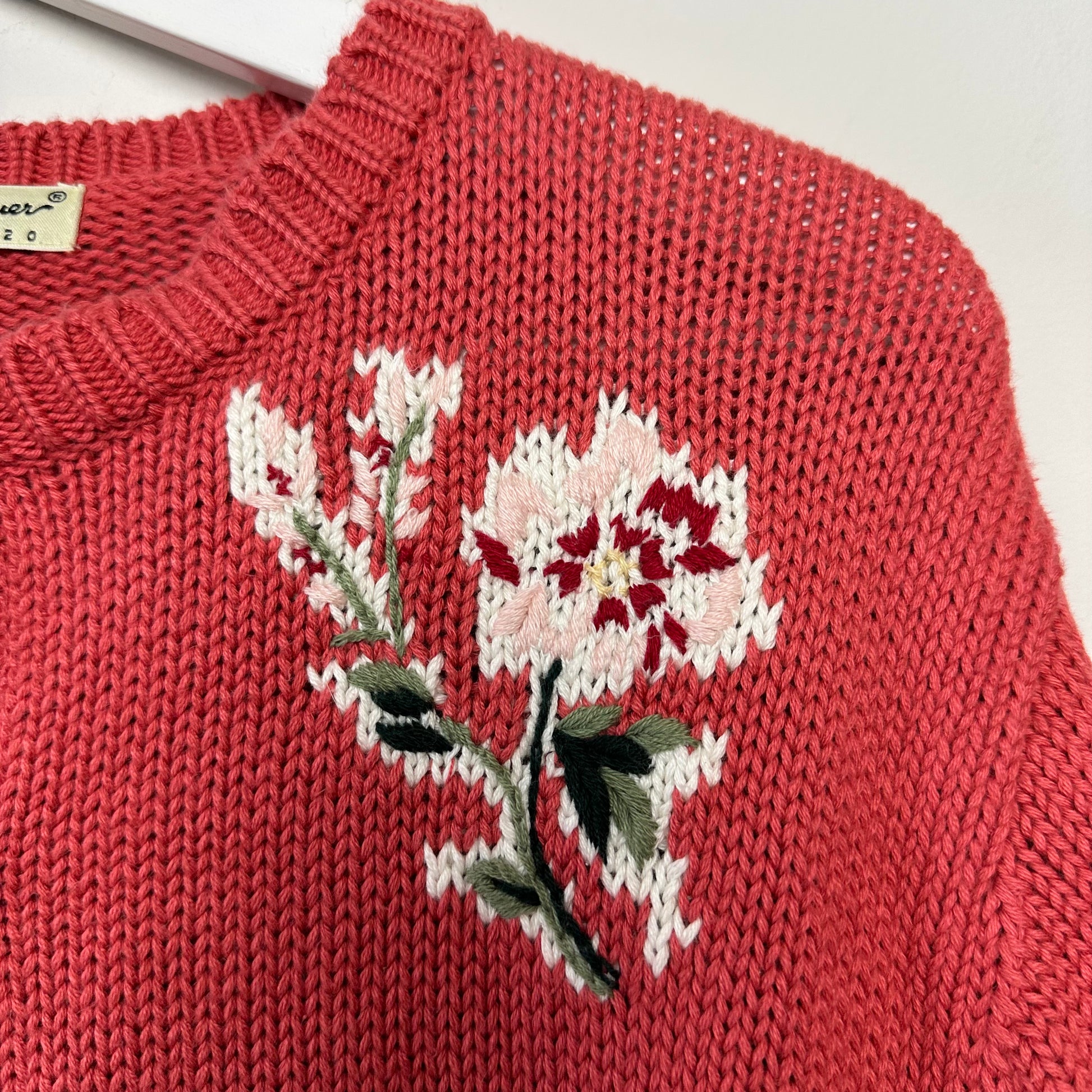 This Eddie Bauer cardigan sweater is crafted from soft cotton for a comfortable fit. It features a charming floral pink coral pattern, and is perfect for layering on cool days. The medium weight chunky knit is perfect for layering. Cottagecore style retro vibes.