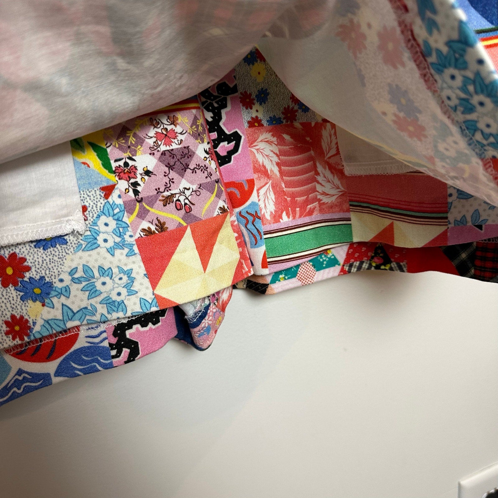Desigual Patchwork Romper Dress Mini Johnson Hartig Pinafore Mosaic Small. Looks like a miniskirt style dress but has shorts underneath and seen from the back. Patchwork quilt print style in mosaic patterns. Rainbow colors. Crew neck, zip in the back, front pockets, soft cotton blend fabric. Sustainable fibers with BCI cotton. Jumper dress with a retro vibe.