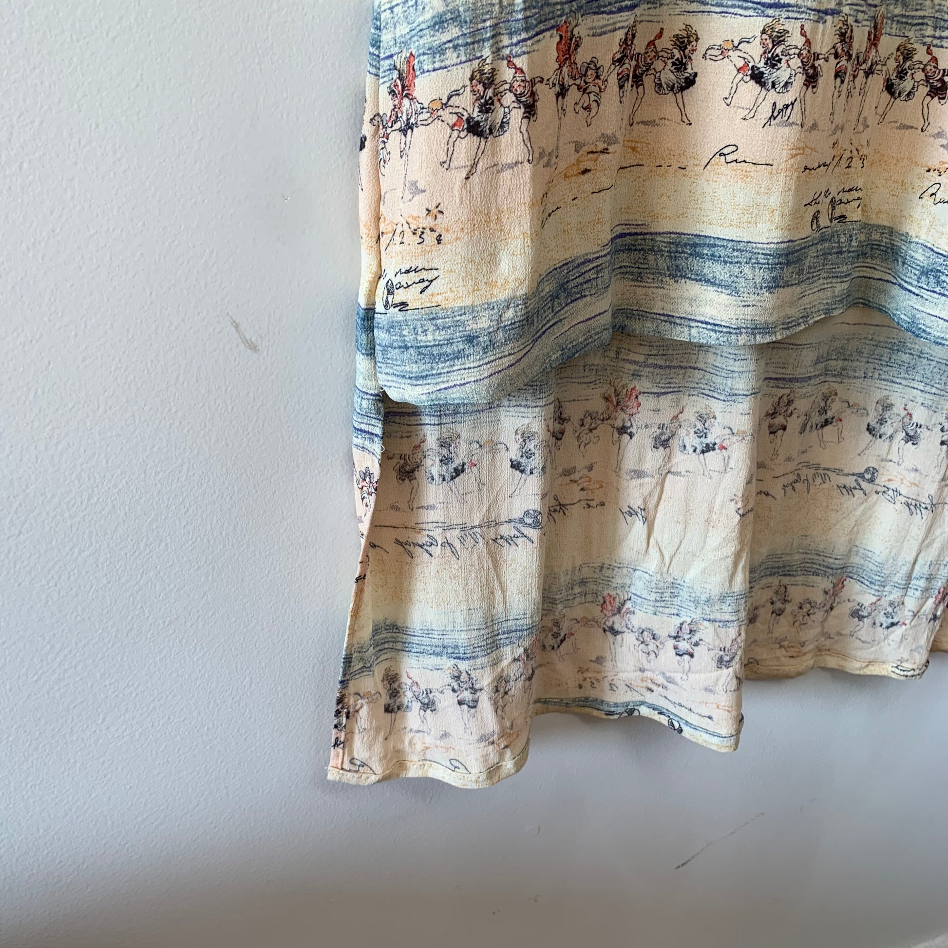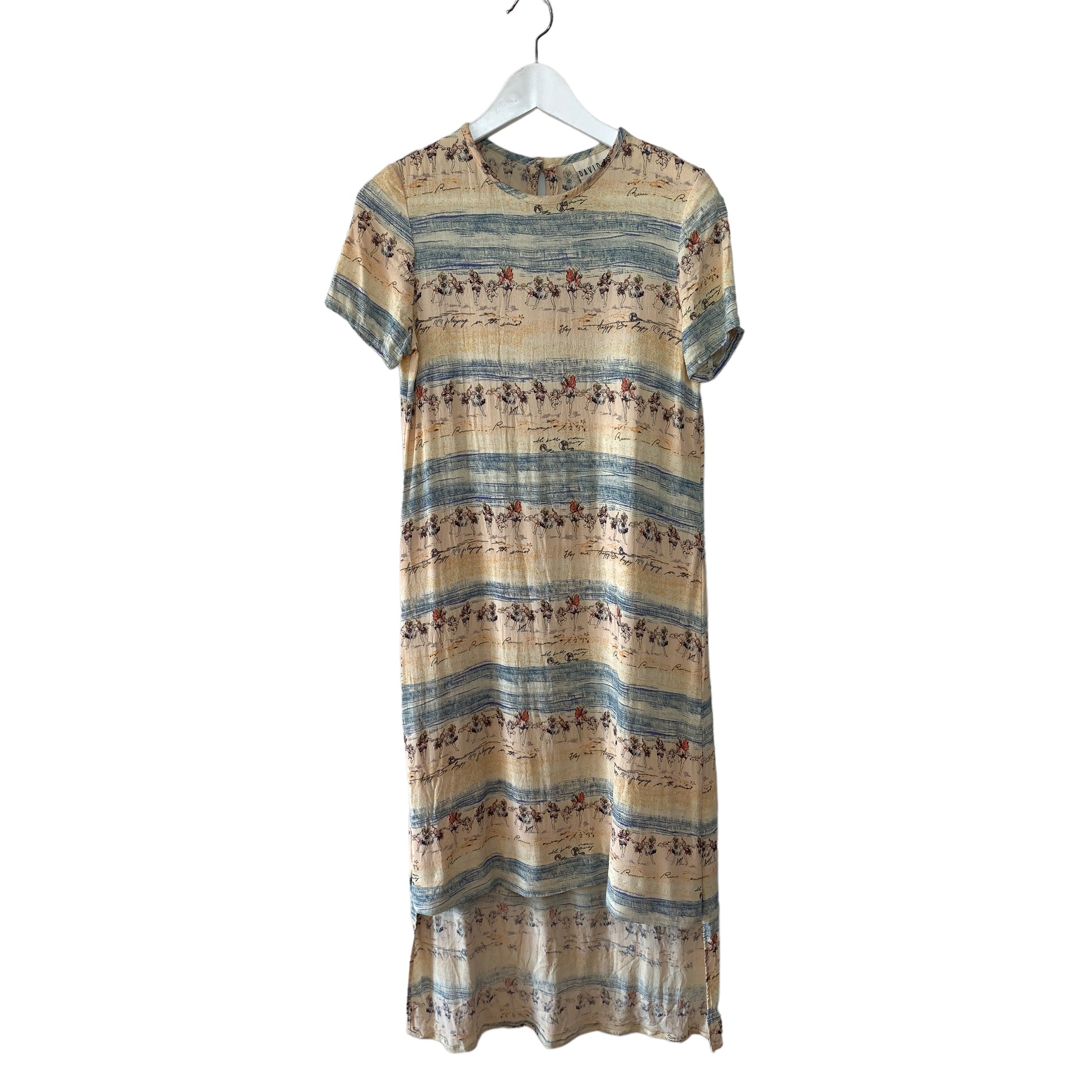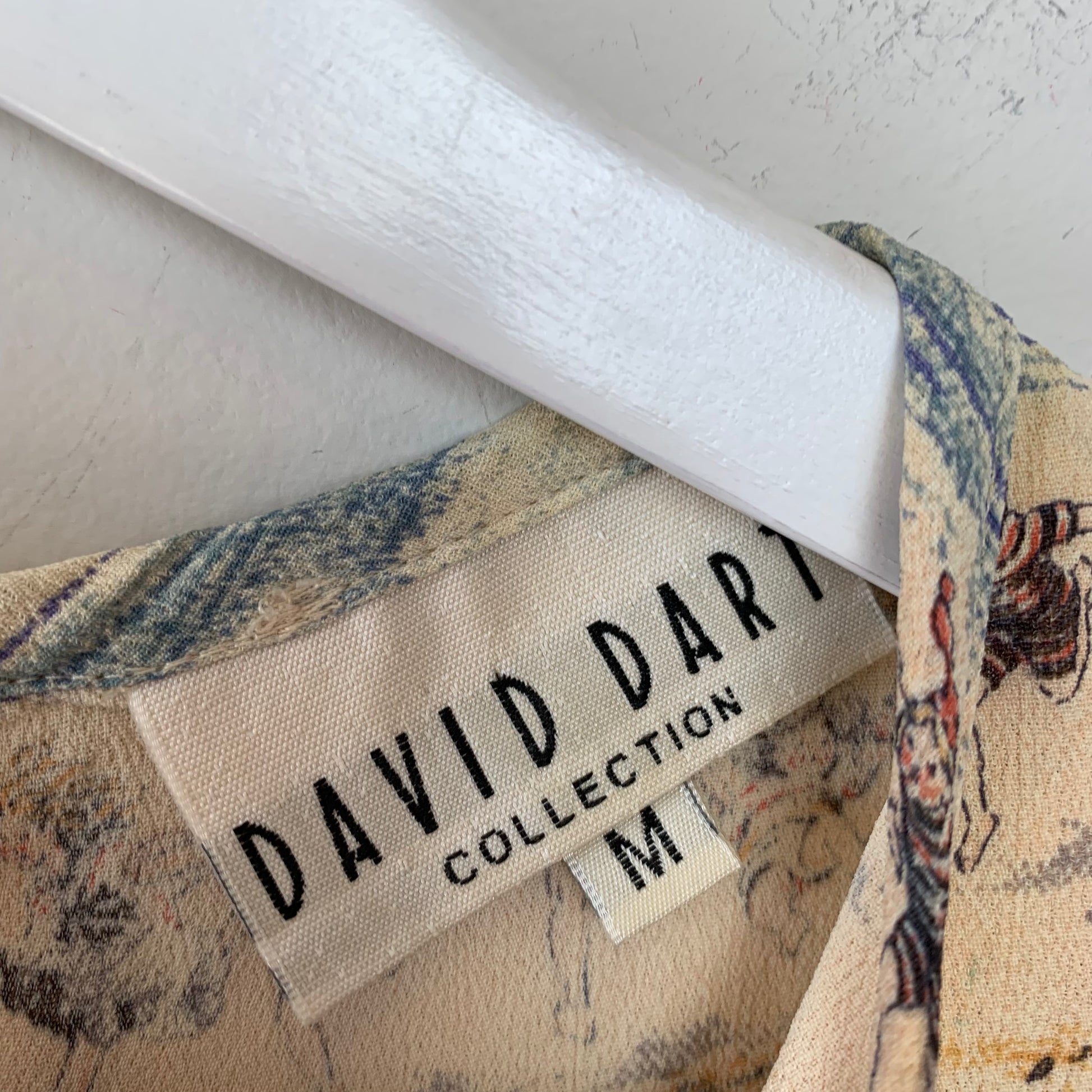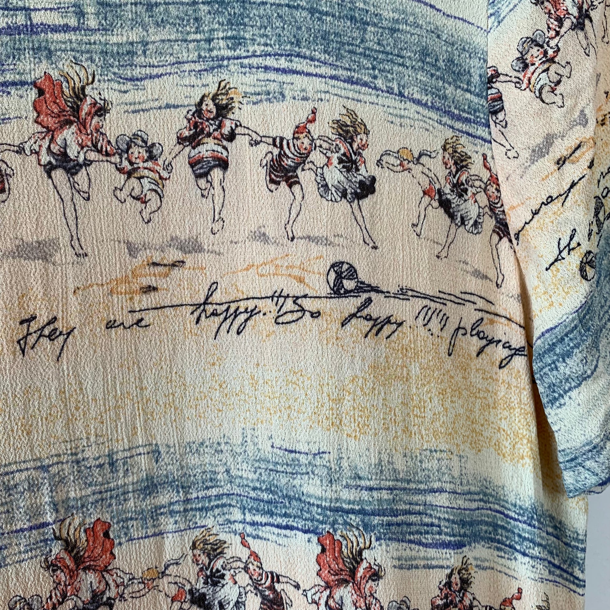 Vintage 90s David Dart Dress Midi Made in the USA. Feminine size medium. Really unique print, children running and holding hands and script that reads "playing on the sound", and "they are happy playing on the sound." Shell button detail in the back. The front has been hemmed by hand slightly higher than the back. Short sleeve midi maxi style dress. Coastal beach setting graphic with sand and water.