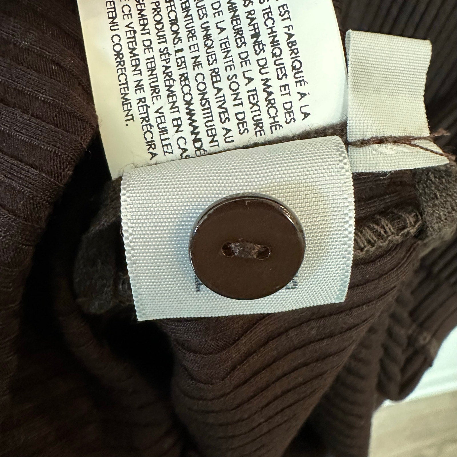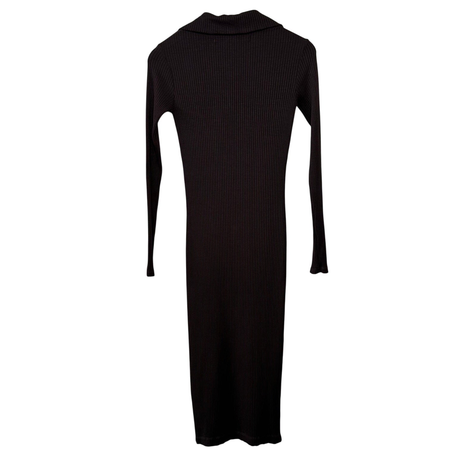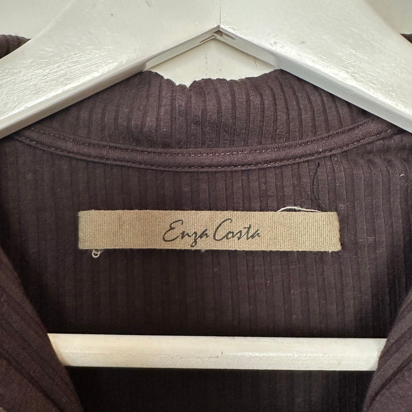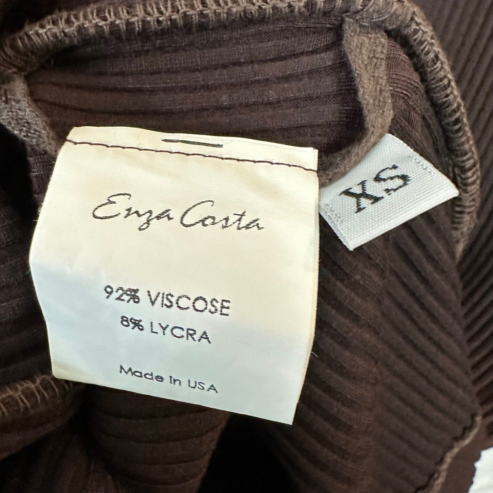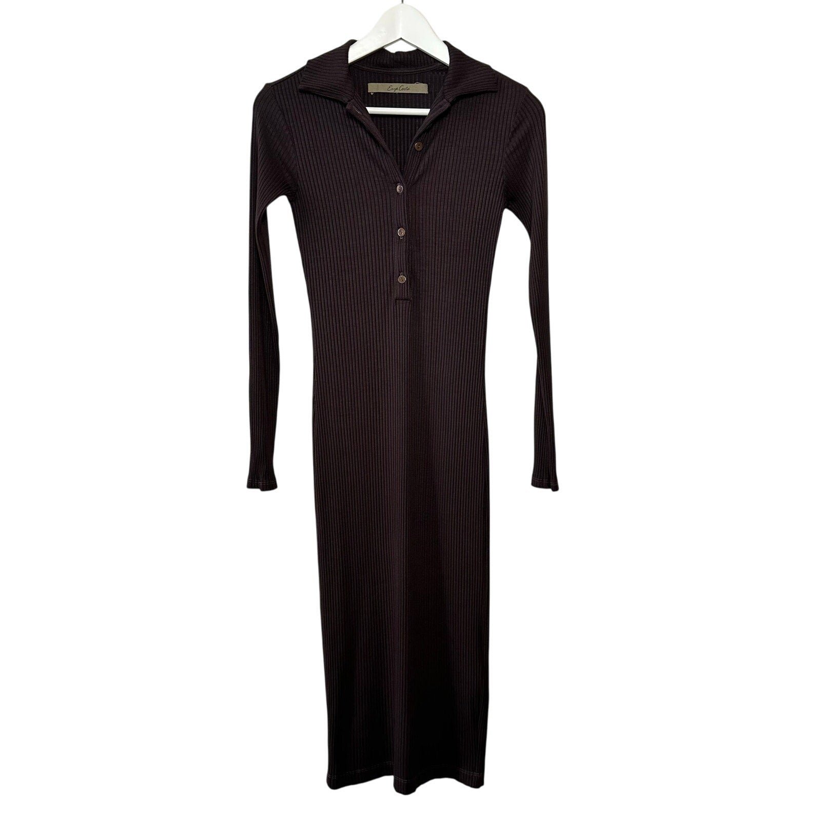 Enza Costa Ribbed Knit Dress Polo Collared Mini Long Sleeve Brown Bodycon XS. Chocolate brown bodycon fitted stretch knit dress. Polo shirt dress style. Button front with a collar. Long sleeve midi dress. Rib knee-length polo dress.