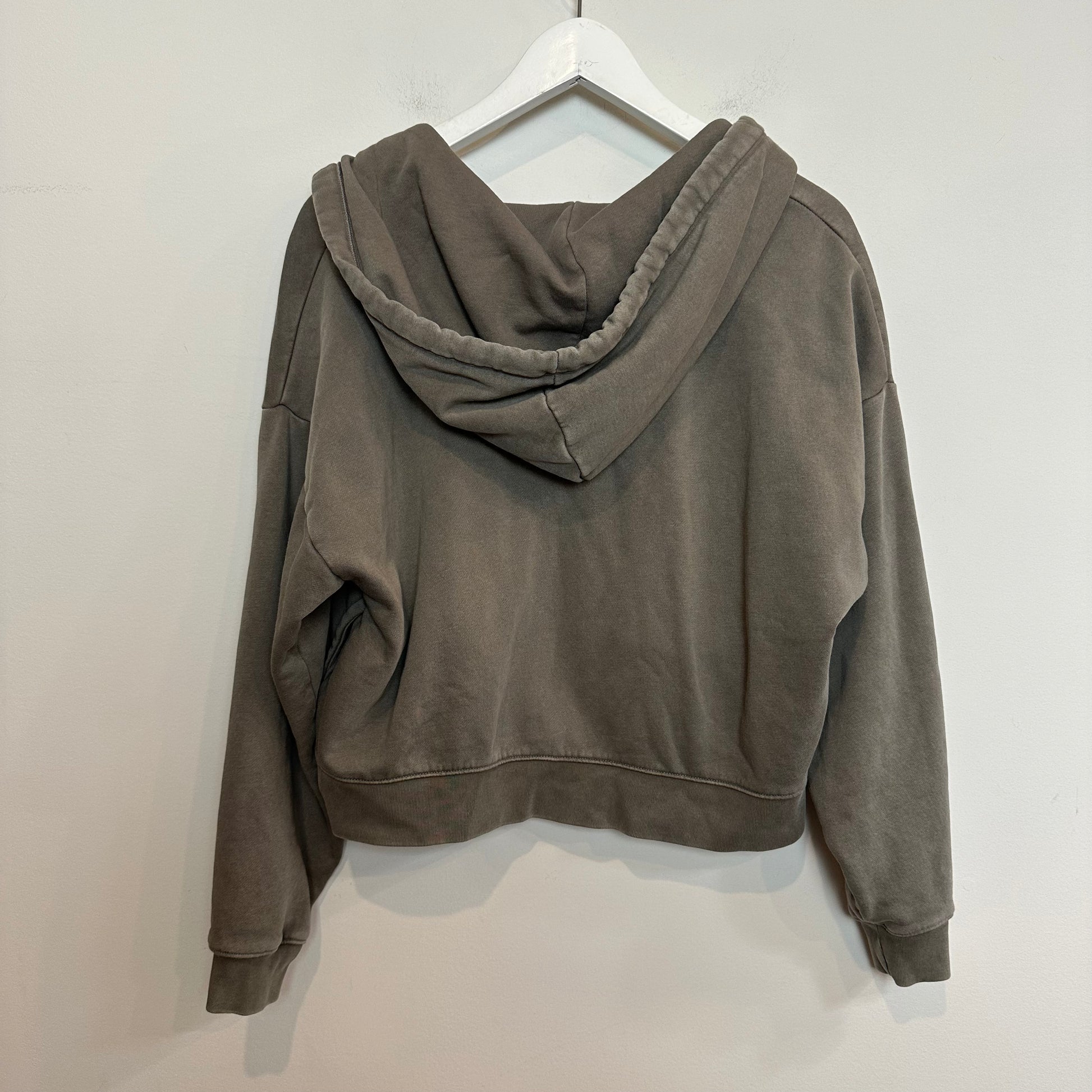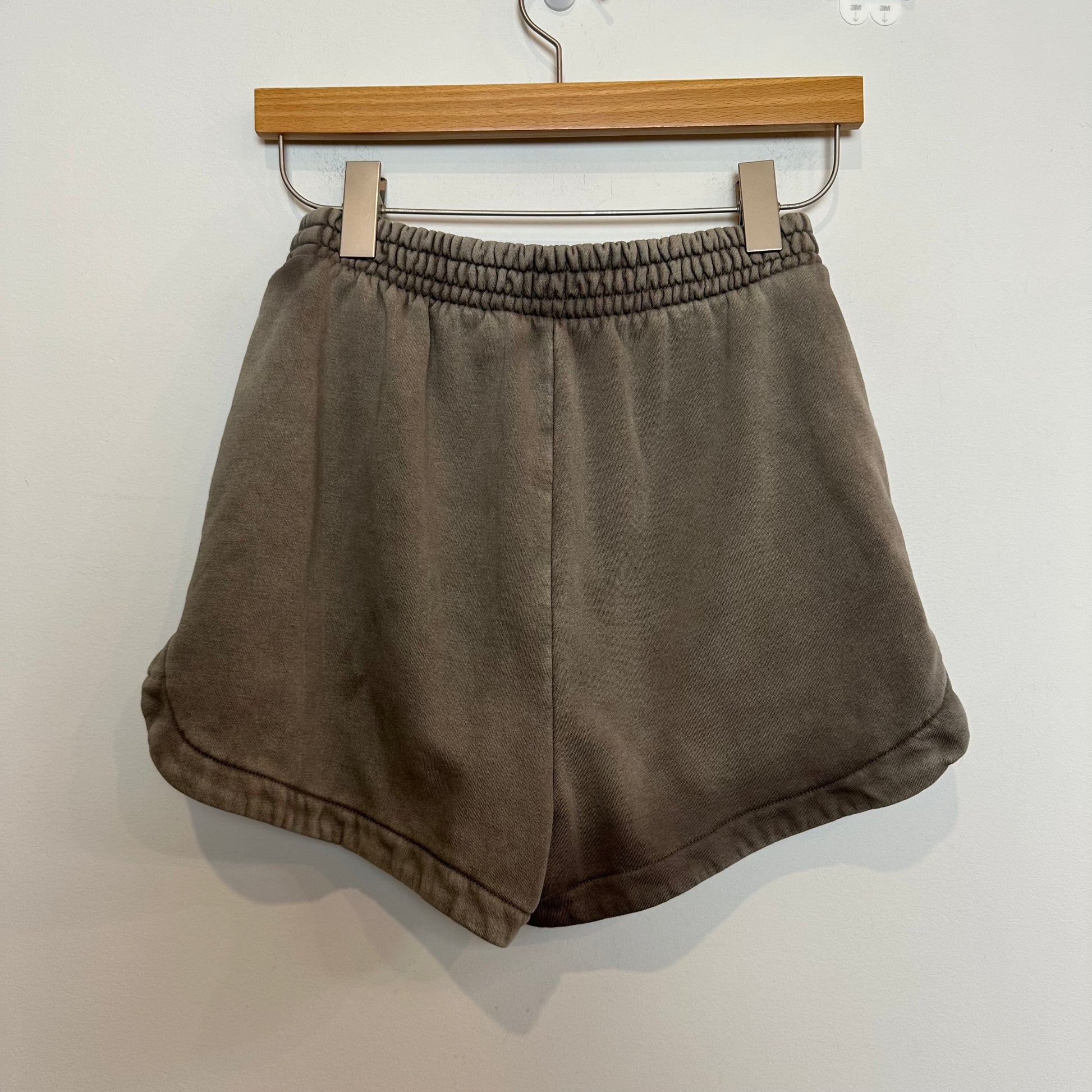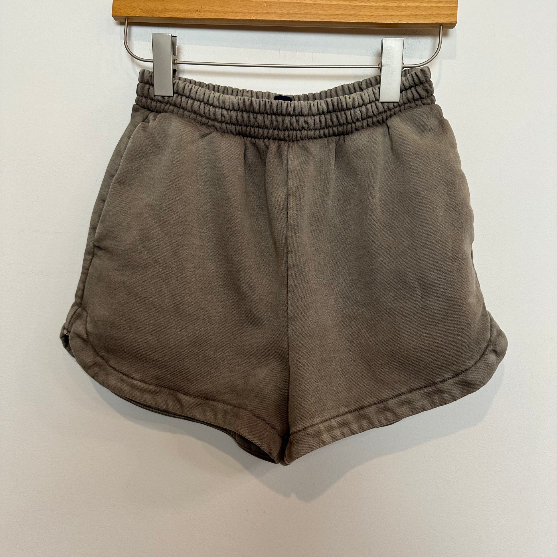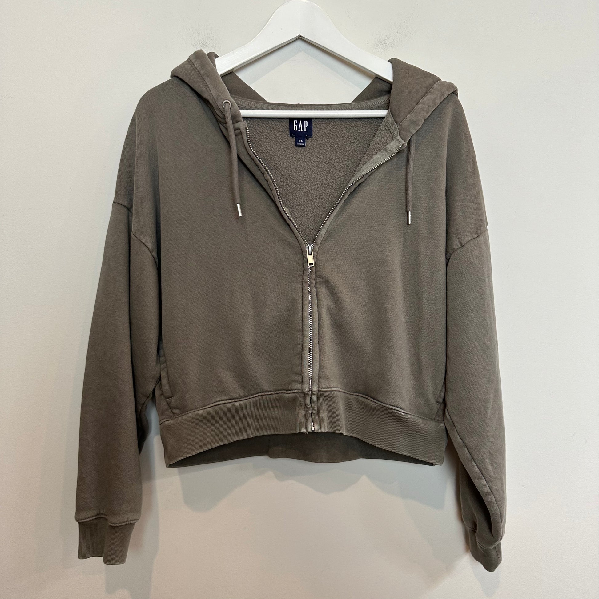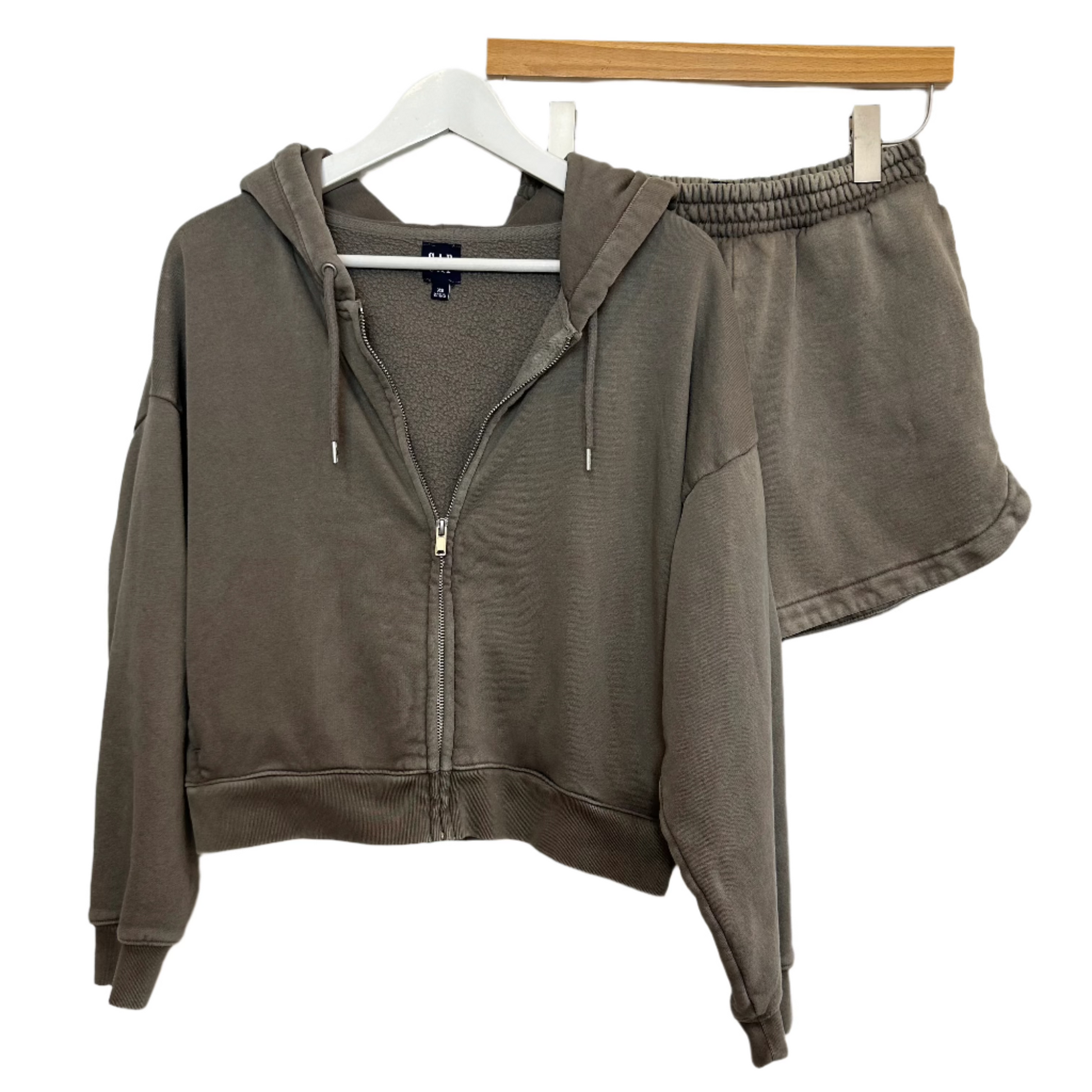 Gap Vintage Style Soft Cropped Hoodie and Soft Sweat Shorts Matching Set XS. The color is called greenish grey and it has hints of olive green, brown, and grey tones. Super soft material. Garment-dyed and made of feel super soft and comfortable. Slightly cropped hoodie zip up jacket with matching, coordinating, sweat shorts. Pull on style shorts with elastic waistband and has pockets!