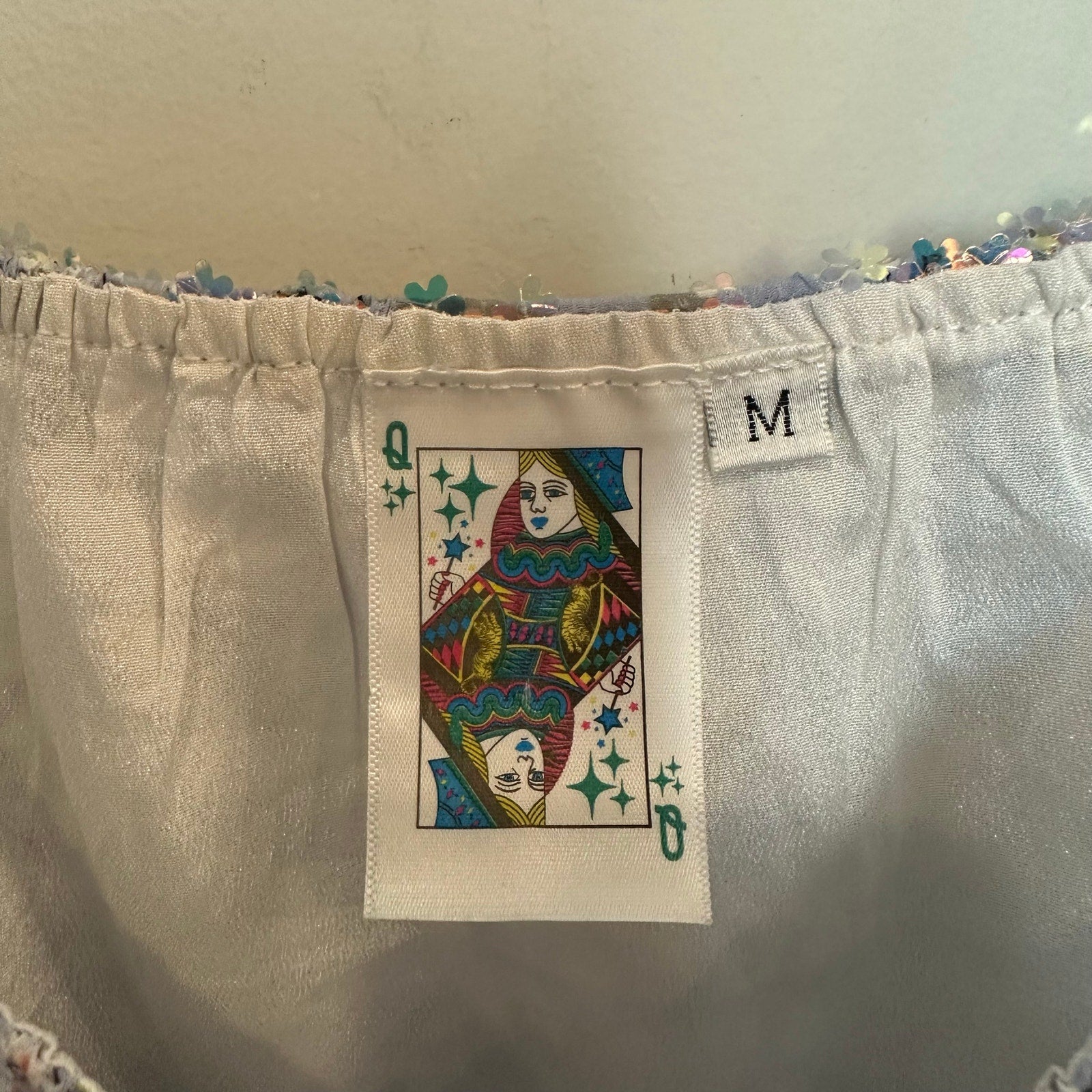 Queen of Sparkles Floral Sequin Feather Tank Purple Top Flower Glitter Medium. Sleeveless blouse with a slightly boxy cropped fit. Flower shaped sequins in a iridescence lavender lilac purple and blue sparkle. Fully lined.