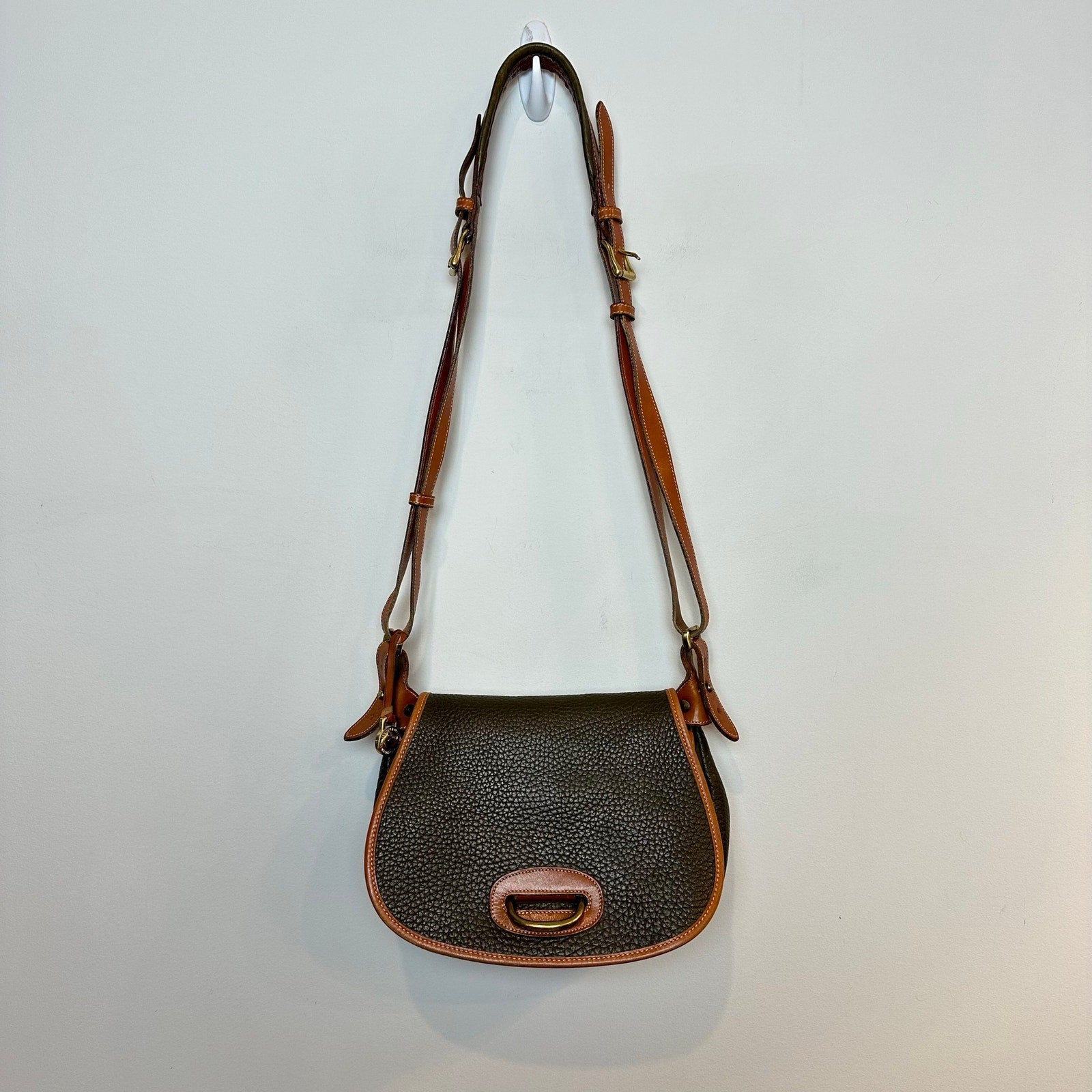 Vintage Dooney and Bourke Large Horseshoe Bag Crossbody Green All Weather Leather. Satchel bag with adjustable padded strap. Back pocket and pocket under the front flap. Dooney duck fob and embossed duck logo. Dooney & Bourke made in the USA tag. Horseshoe shape with horseshoe shaped hardware closure. Classic equestrian style handbag. Solid brass hardware. Beautiful leather and quality construction. Adjustable strap with green padded detail. Lots of pockets!